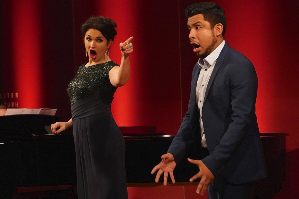 Olga Peretyatko würde den Laden auch alleine schmeißen. Denn die Sopranistin aus St. Petersburg hat ein Talent dafür, einen Raum mit ihrer Persönlichkeit zu füllen und dem Publikum das Gefühl zu geben, bei einem quasi privaten Moment der großen Kunst dabei zu sein. Sie schlüpft in Rollen von der Lucia bis zur Mimi und verkörpert dabei doch so eindeutig einen Charakter hinter der Stimme, dass man ihr stundenlang beim Entwickeln der Musik zuhören könnte. Wenn ihr allerdings jemand wie der junge Bass José Coca Loza zur Seite steht, der seinerseits viel Spaß am Experimentieren mit den Möglichkeiten der Bühne hat, dann kommt noch eine Prise mehr Temperament ins Spiel, so dass man Opernszenen imaginiert, ohne Requisiten und mehr als den vergleichsweise kleinen Raum neben dem Flügel im Saal des Literaturhauses zu brauchen.